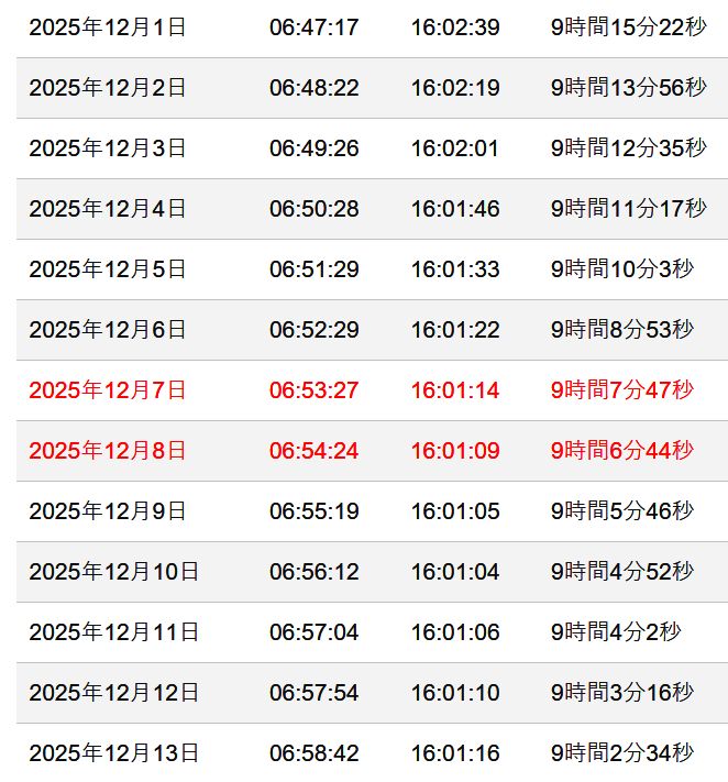 左から、日付・日の出時刻・日の入時刻・昼の時間