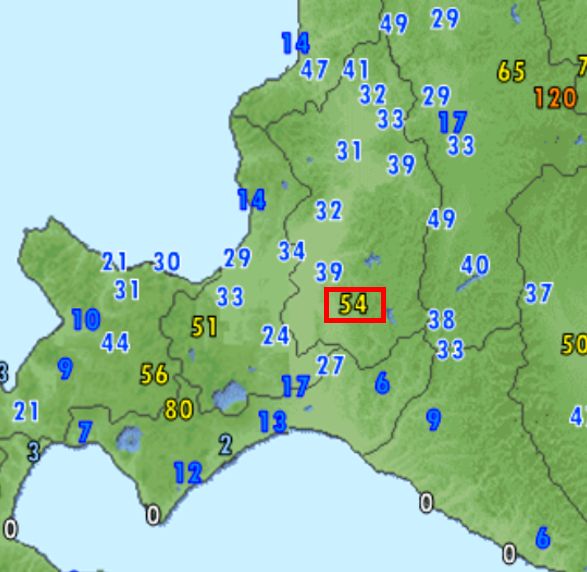 今年の夕張は雪が多いようで、今朝9時時点の積雪は54cm。右図